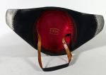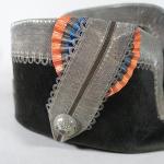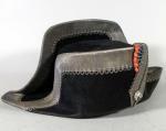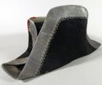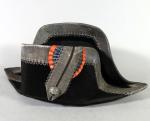 Bicorne de gendarme modèle 1895 en feutre bordé d'un galon argent, d'une ganse plate soutenant une cocarde nationale en tissu et fermant à l'aide d'un bouton en maillechort portant l'inscription « Gendarmerie Nationale ». Cachet intérieur de fabricant « E. Bidal 3 rue Richelieu Paris »