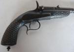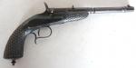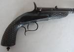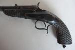 Pistolet de tir, système WARNANT, canon rond à pans, gravé et décoré de cloutage, pontet repose-doigt, crosse en noyer en partie quadrillé, noirci, décoré d'un cloutage, vers 1860 (bon état). Long. du canon : 21 cm. Expert : Gaétan BRUNEL Tél : 06.63.56.29.90. 221