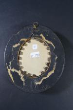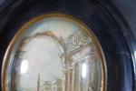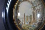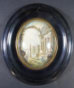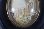 Miniature ovale à décor de ruines romaines animées dans le goût d'Hubert Robert, 8 x 6,5 cm, cadre ovale en bois noirci à verre bombé, ép. XIX's