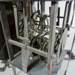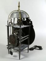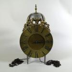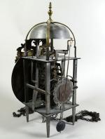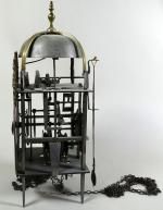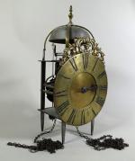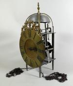 Pendule lanterne ou capucine d'époque XVIII's siècle en laiton et fer forgé, le dôme surplombant un large timbre, une aiguille. H. totale : 38 cm. Larg. 20 cm. Prof. 16 cm.