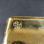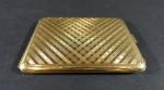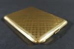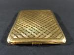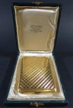 Boîte à cigarettes en or 750 millièmes à motifs gravés de croisillons, fermoir serti d'un ligne de saphirs calibrés, l'intérieur avec barrette ajourée et chiffre gravé, porte un numéro 1235720. Poids : 178,30 g - Long. : 11,5 cm - Prof. : 8,5 cm - Prof. : 0,9 cm