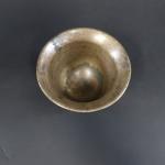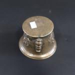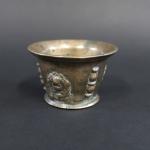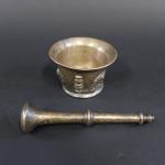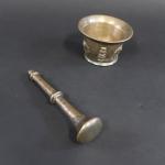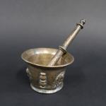 Petit mortier en bronze à motif de têtes d'amours et pilastre, ép. XVII's. Haut : 6,7 cm - Diam : 10 cm, et un pilon. Long : 17 cm
