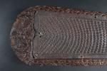 Exceptionnelle râpe à tabac en bois sculpté à riche décor orné au centre d'un monogramme dans un entourage de cornes d'abondance, coquilles, rinceaux, etc..., terminée par une coquille Saint-Jacques dont le revers en forme de coeur et complète sa grille en fer, époque XVIII's. Long : 47 cm (quelques manques, fentes, et trous de xylophages)