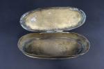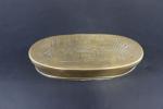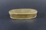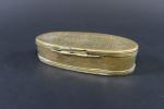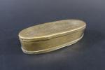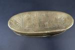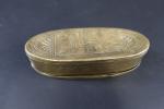 Tabatière ovale en laiton gravé de scènes d'intérieur bibliques, gravée sur les côtés "Verlaat de Werelt", ép. XVIII's. Long. : 14,5 cm - Haut. : 3,5 cm