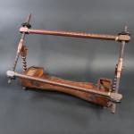 Métier à broder d'époque XVIII's, le plateau en bois de placage marqueté de branches de fleurs et deux petits casiers latéraux à rideaux, montants torsadés supportant le cadre. Long. : 0,64 m - Haut. : 0,30 m - Prof. : 0,46 m (petits accidents et manques)
