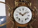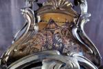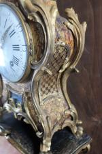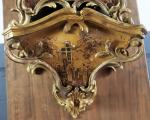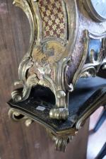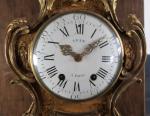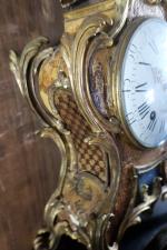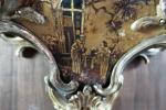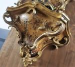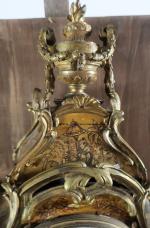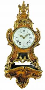 Cartel d'applique et son cul de lampe d'époque Louis XV en vernis Martin à décor doré de chinoiseries sur fond ocre, ornements de bronze doré et surmonté d'une urne flammée à guirlandes, cadran émaillé et platine signés VIBER à Paris. Haut : 89 cm (suspension à lamelle, fentes, manque au décor)