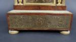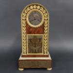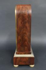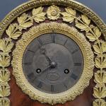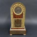 Pendule borne d'époque Restauration en placage d'acajou et frise de feuilles de laurier en encadrement, ornée de deux plaques en laiton à décor polychrome gravé à l'acide de cornes d'abondance, lyre, rinceaux, palmettes, etc... Haut : 45 cm