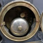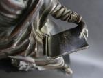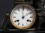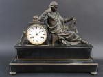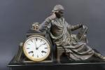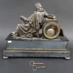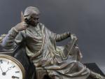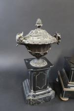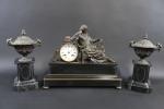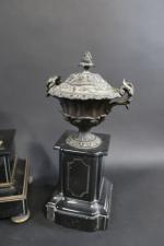 Garniture de cheminée d'époque Napoléon III et bronze patiné et marbre noir, comprenant une pendule à sujet de Blaise Pascal écrivant les Lettres Provinciales. Haut. : 34 cm, et une paire de cassolettes, le couvercle à décor de feuilles de chêne. Haut. : 30 cm