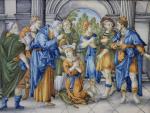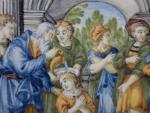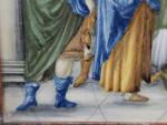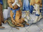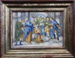 ITALIE, CASTELLI : Plaque rectangulaire en faience à décor polychrome de la présentation de Jésus au temple entouré des docteurs de la loi dans le temple. Porte au revers le numero 1243. Elle est présentée dans un cadre en bois doré, ép. XVIIIe siècle. Long : 28 cm hauteur : 20 cm - Expert : Manuela FINAZ de VILLAINE Tél 01.45.27.17.46