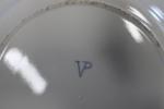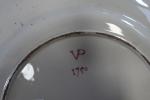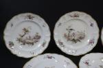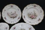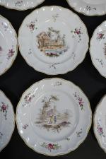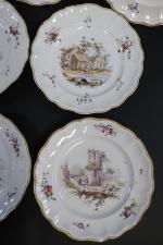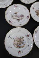 MARSEILLE, dans le goût de la Veuve PERRIN : Suite de dix assiettes en faience à bord contour et décor polychrome de scènes animées et fleurettes, bord à filet jaune, portent une marque. Diam : 24 cm (égrenures, usures)