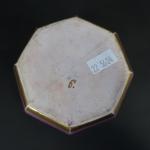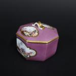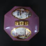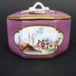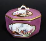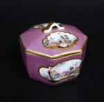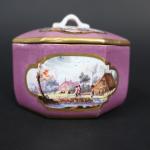 MEISSEN : Pot à sucre couvert en porcelaine de forme octogonale à décor polychrome de paysages animés dans des réserves sur fond pourpre, les bords ornés de liserés dorés. Marque : épées croisées en bleu (effacés) et 9 en or. XVIIIème siècle, vers 1740. Hauteur : 7 cm, Diamètre : 8,5 cm