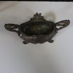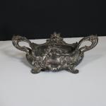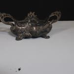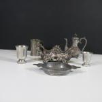 Réunion de six objets en étain comprenant : une écuelle, deux timbales, une théière, une chope et une jardinière à deux anses de style rocaille.