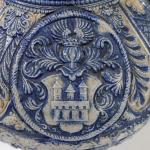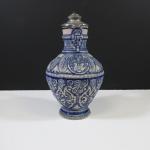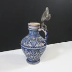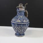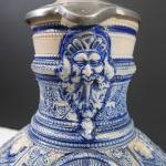 Grande aiguière à anse en grès à décor bleu blanc mascaron, palmes, lambrequins et guillochage en relief. Couvercle en étain.