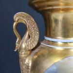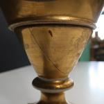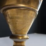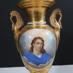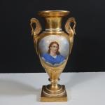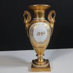 Vase en forme d'urne sur piédouche en porcelaine sur fond or, à décor en réserve d'un portrait de Jésus et de l'inscription JHS, anses col de cygne.