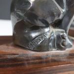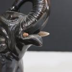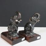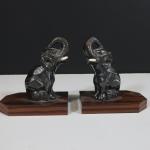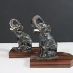 MOREAU H. (XXème) Serre-livre en métal argenté à décor d'éléphants assis en ronde bosse, socle en ébène de Macassar.