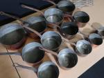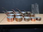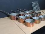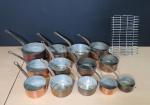 Ensemble de 13 casseroles en cuivre anciennes (diamètre 22 à 12 cm), égouttoir à vaisselle (usures).