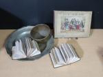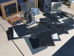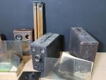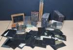 Important lot d'appareils et accessoires photos anciens époque fin XIXè comprenant des passes-vues stéréoscopiques et de nombreuses plaques photos ( format 18 X 13 cm) : scènes de familles, paysages, monuments etc on joint : missels paroissiens en cuir, un plat en étain, une boite du jeu du cheval blanc incomplet (usures)