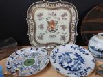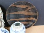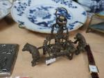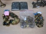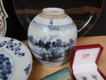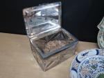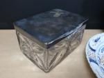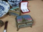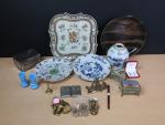 Lot comprenant : objets en céramiques : plats (cassés et recollés), vases, boite à gâteaux en verre moulé et monture en métal argenté, boite à cigarettes Art Nouveau en métal, structure en métal avec 2 ours, collection de boutons en laiton ( 62 boutons), boite à bijoux, petit vase en verre opalin bleu, paire de boutons de manchettes et grand plat en grés émaillé noir et marron (usures)