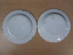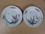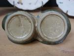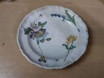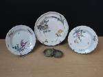Dans le goût de Jacques Gruber (1870-1936) - Petit saleron double en céramique émaillée, porte une signature illisible, on joint : une grande assiette (diamètre : 24 cm) et une paire d'assiettes à dessert (diamètre : 19 cm) en céramique ancienne à décor de fleurs et boutons de rose, époque XIXè (usures).