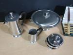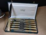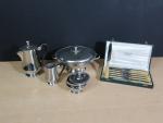 Lot comprenant : 12 couteaux en inox sous écrin, récipient en inox, parfait état.