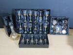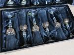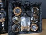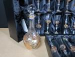 Artisanat de Lorraine : beau service de verres en cristal et dorures comprenant : 12 verres à vin, 6 verres à champagne, 1 service à liqueur avec 2 carafes, en boites (parfait état)