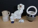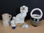 Lot d'objets divers en céramique comprenant : un vase à anses en faïence année 1950 signé GUILLOT (haut : 30 cm), grand chien en céramique émaillé de STAFFORDSHIRE (haut : 35 cm), pichet en céramique signé SION, tête d'amour en biscuit de Limoges, truie en porcelaine dans le style de Copenhague.
