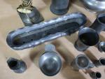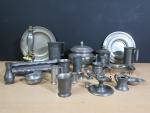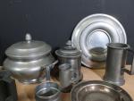 Lot d'objets divers en étain comprenant : chopes, soupières, bougeoirs, timbales etc