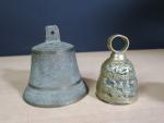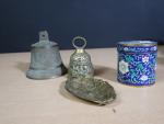 Lot comprenant : deux cloches en bronze, coupe vide-poche en bronze d'époque 1900 à décor d'une femme nue, boite en émaux cloisonnés de la Chine. (usures)