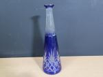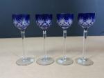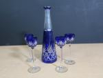 Lot comprenant : une carafe et 4 verres à pied en cristal teinté bleu.