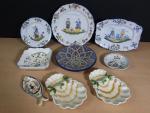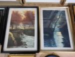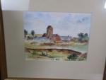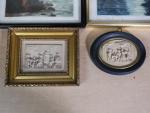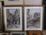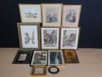 Lot de 9 pièces encadrées sous verre et 3 tableautins comprenant : Ménard : Troyes, la rue des chats, paire d'aquarelles ( 28 X 20 cm), d'après Massey : Troyes, le ru aux cailles (37 X 25 cm), d'après Menguy : Église du village, aquarelle signée (13 X 16 cm), paires d'aquatintes représentant des rivières, reproductions paysages asiatiques, paire de gravures de mode d'après Laure Noël, 2 petits tableautins en albâtre représentant des scènes de buveurs, panneau de bois représentant un temple à Pekin