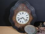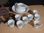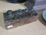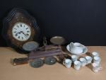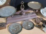 Balance Roberval en fonte peinte en marron de 10 kg, on joint une pile de poids, un carillon oeil de boeuf Napoléon III, bassin et pot de chambre en porcelaine blanche, tasses Mazagran (usures)