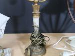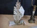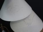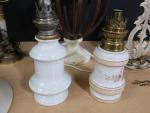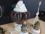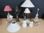 Lot de lampes modernes et anciennes comprenant : 2 lampes à petrole en porcelaine, une lampe en tole, une lampe en ceramique et une lampe en albâtre, avec abat-jours brodés.