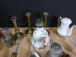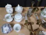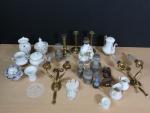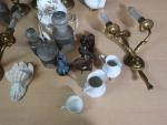 Lot divers comprenant : paire d'appliques murales en métal doré, lampe à pétrole en porcelaine blanche, 2 théières en porcelaine blanche, 2 sucriers en porcelaine blanche, 1 tasse à café, etc (usures).