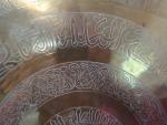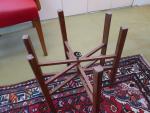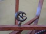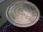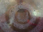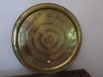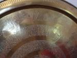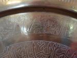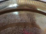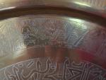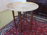 TURQUIE (?) : Guéridon composé d'un plateau en laiton gravé d'écritures coufiques, frise florale et frise à décor égyptien de pyramides, obélisques, etc..., sur piètement pliant à six pieds, à décor marqueté, orné au centre du croissant de lune et étoile. H. 50 cm. Diam. 59 cm