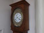Horloge comtoise époque XIXème siècle à caisse violonnée peint faux bois, à décor peint de fleurs, sur fond faux bois à filets, cadran émaillé signé SENG à Saint Mards en Othe, entourage en laiton repoussé à décor d'oiseaux et corbeille fleurie, balancier à compensation, lyre et lentille (fentes à la caisse et réparations). H. 228 cm. Larg. 49 cm