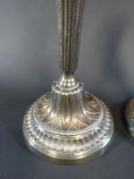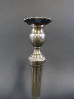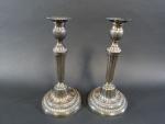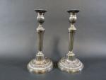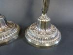 Paire de bougeoirs de style Louis XVI en métal argenté, fût à cannelures, binet et doucine du pied à longues feuilles. Haut : 27 cm (ancienne restauration à un binet) - 351