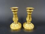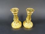 Paire de bougeoirs bas de toilette de style Louis XVI en bronze doré richement et finement ciselé de feuilles d'acanthes, base à doucine, fût en balustre à cannelures et asperges. Haut : 15 cm (repercés pour l'éléctricité, bobèches rapportées)