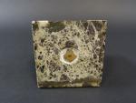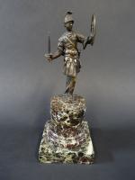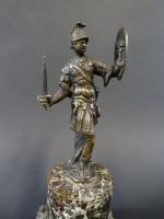 Ecole italienne du XVIIème siècle : Centurion romain portant glaive et bouclier en bronze patiné, sur socle en forme de colonne tronquée en marbre veiné. Haut. totale 24 cm