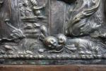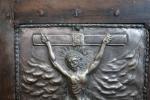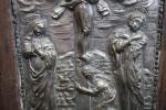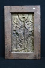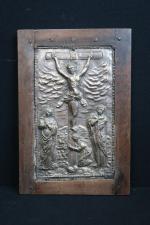 Plaque en métal repoussé argenté à décor d'une scène de Crucifixion, 41 x 25, cadre en bois