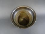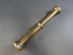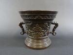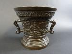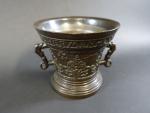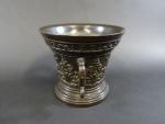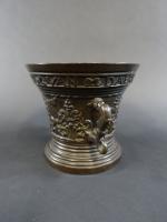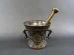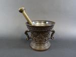 Mortier en bronze patiné à décor en léger relief d'une frise de fleurons et rinceaux et portant en bandeau l"inscription "Hermen Van Daerninck Anno 1551", anses latérales en forme de dauphins, avec pilon. Haut : 14,5 cm Diam : 16 cm