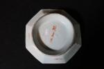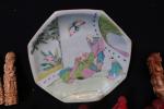 - Une coupelle sur pied en porcelaine octogonale à décor de personnages, marquée (L:21 cm)