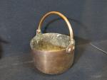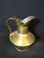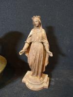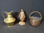 Réunion comprenant : - Statuette de la Sainte Vierge Miraculeuse, fonte (H: 37 cm) - Chaudron en cuivre à anse - Aiguière en laiton