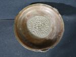 Auguste Maximilien DELAFONTAINE (1813-1892). Belle coupe en bronze à patine brune, au centre une scène mythologique de banquet à l'antique, décor de chars antiques, chiens de chasses, poissons, gibier, grappes de raisin etc... motif de roseaux sur le piétement. Marquées "AD" à l'étoile sur la base, sur un socle en marbre noir. Haut. 25 cm - Diam. 30 cm (usures, manques)
