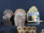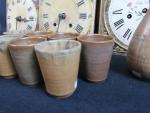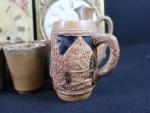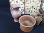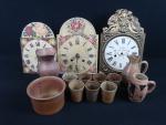 Lot comprenant : 3 mécanismes d'horloge comtoise - 6 verres en grès - 2 pichets en grès - 1 choppe en barbotine