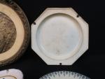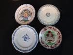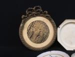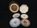 Lot de cinq assiettes en faïence dont SARREGUEMINES - Cadre tondo en bois sculpté à décor de ruban noué (Diam. 35 cm).