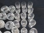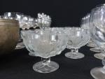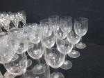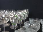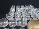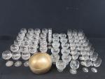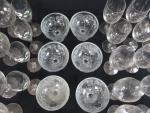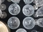 Lot d'environ 62 pièces de verrerie comprenant : verres ballons ; flutes à champagne PERRIER-JOUËT ; coupes à fruits à décor de fruits en relief ; verres à pied ; etc.