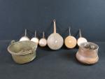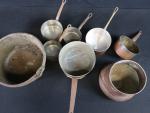 Lot en cuivre comprenant : - batterie de 6 casseroles (D de 14 à 22cm) - 1 marmite avec son anse (D : 30cm) - 1 chaudron.