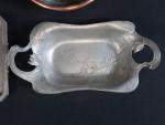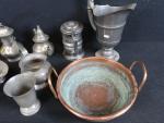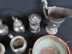 Lot d'objets en cuivre et étain comprenant : 1 pichet ; 2 théières ; 2 choppes ; 1 cruche ; 1 bassine ; 1 gobelet ; 1 saucière ; 1 ravier ; 1 plateau ; 1 plat de présentation à anses mouvementées ; etc.