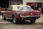 Ford Mustang Cabriolet V8 289 ci, Année 1965, 200 CH, 88 130 KM, 2ème main, carburateur double corps, boite de vitesses automatique C4. Cette voiture, numéro de série 5R08C177833, a été fabriquée dans l'usine de San José en Californie. Restaurée il y a 6-7 ans aux Etats Unis (carrosserie, sellerie et peinture, présence des factures), elle se présente dans une peinture «Burgundy Metalic» provenant du nuancier du millésime 1965. La nouvelle sellerie est un vinyle beige et bordeaux. La teinte d'origine était bleu clair métallisée (code peinture Y) et une sellerie en vinyle de couleur bleue (code sellerie 22).