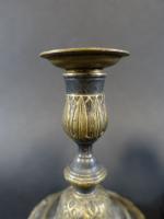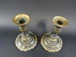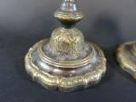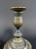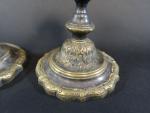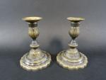 Paire de bougeoirs de toilette de style Régence en bronze à décor de lambrequins, longues feuilles et oves, ép. XIX's. Haut : 15 cm